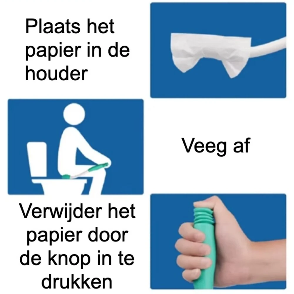 - Om het gebruikte papier weg te gooien, druk je op de drukknop aan het uiteinde van de afveeghulp, zodat het in het toilet valt.