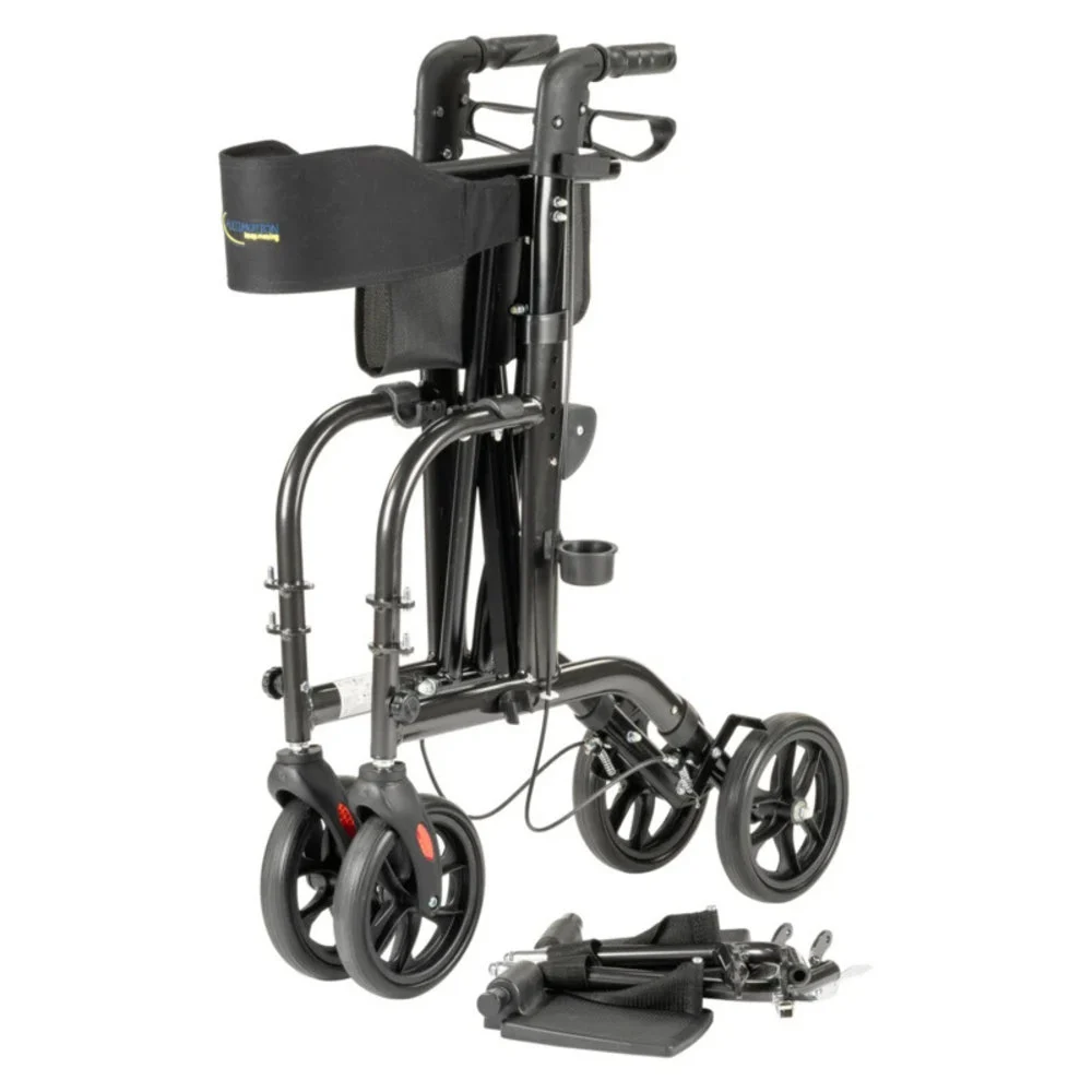 Deze praktische rollator-rolstoel wordt geleverd met in hoogte verstelbare duwhandvaten en voetsteunen, een handige boodschappentas en een stokhouder. Het totale gewicht is slechts 9,4 kg.