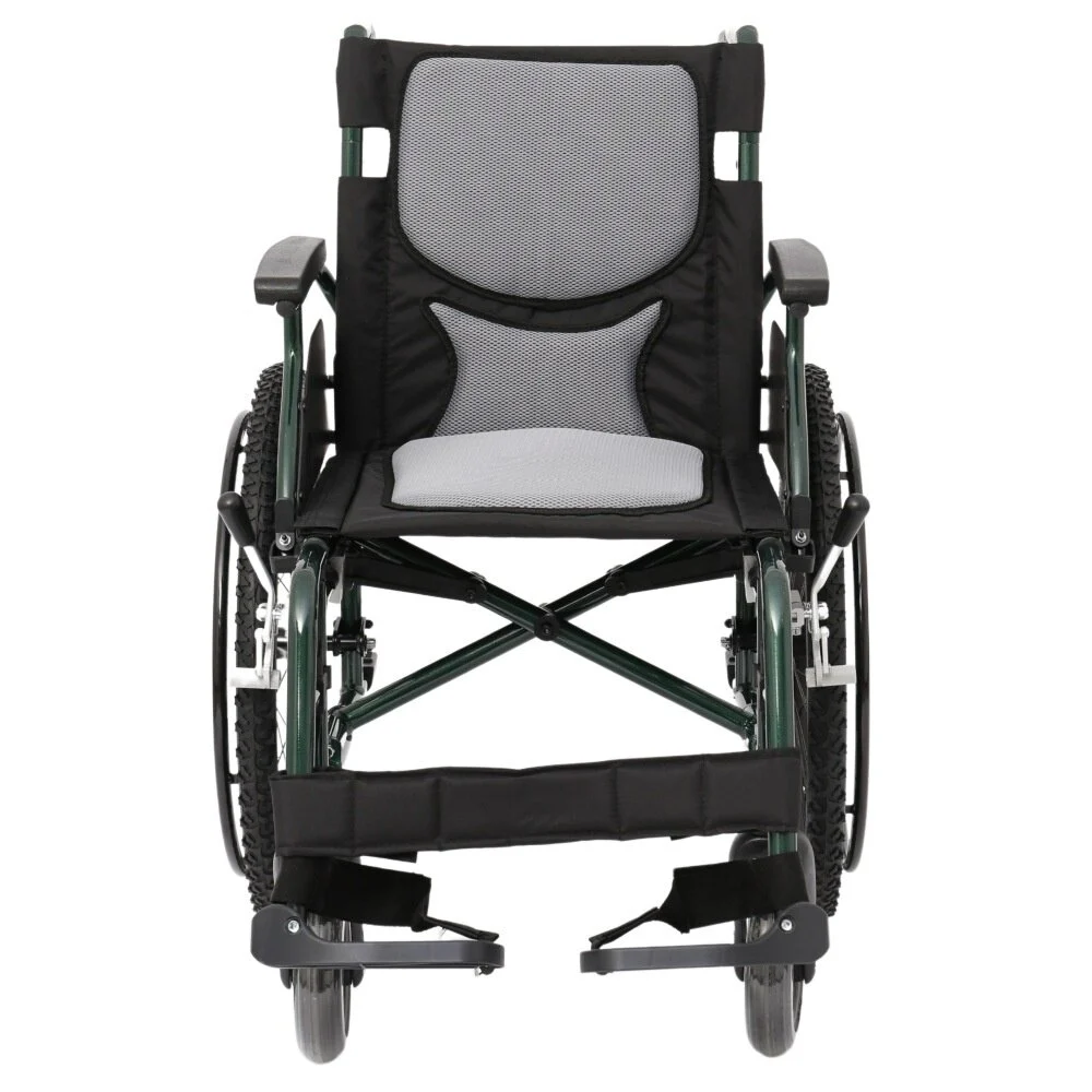 Comfortabel rijden op elk terrein: De rolstoel met luchtbanden biedt uitstekende vering en stabiliteit. De brede voorwielen zorgen voor extra rijcomfort, terwijl de dikke achterbanden met grof profiel grip geven op ongelijke wegen. Hierdoor rijdt de M10 niet alleen comfortabel op vlakke ondergrond, maar ook op grind, gras of straatstenen.